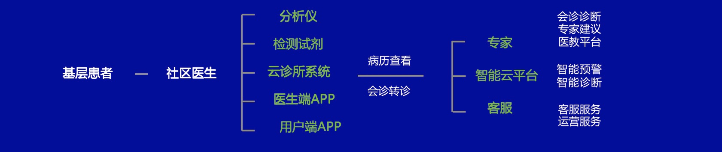 以高性能、易操作的 Cloud POCT 设备为基础,通过覆盖基层医疗机构、患者、运营体系的多终端软件系统实现信息化管理,结合大数据和云计算,以及AI人工智能进行辅助诊断与解析,能够帮助基层医生准确判断病因,实现精准用药,显著提高基层医生诊断能力和水平。